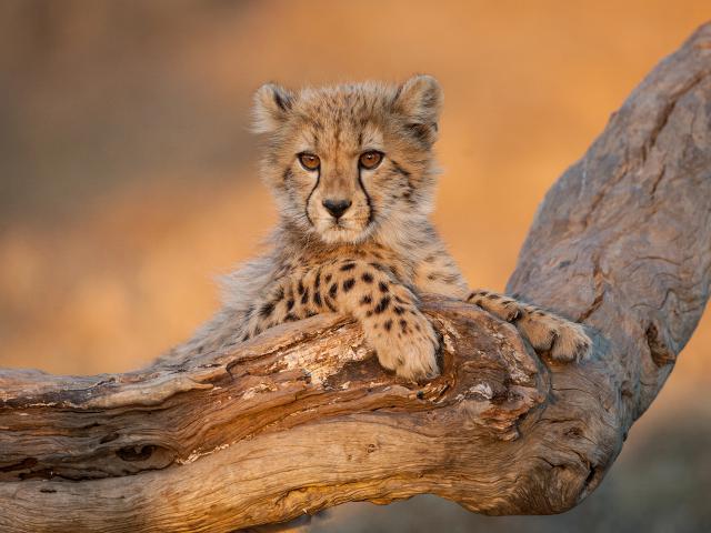 Cheetah_38Baby cheetah with big eyes portrait sitting on a dead log in Kruger Park, South Africa