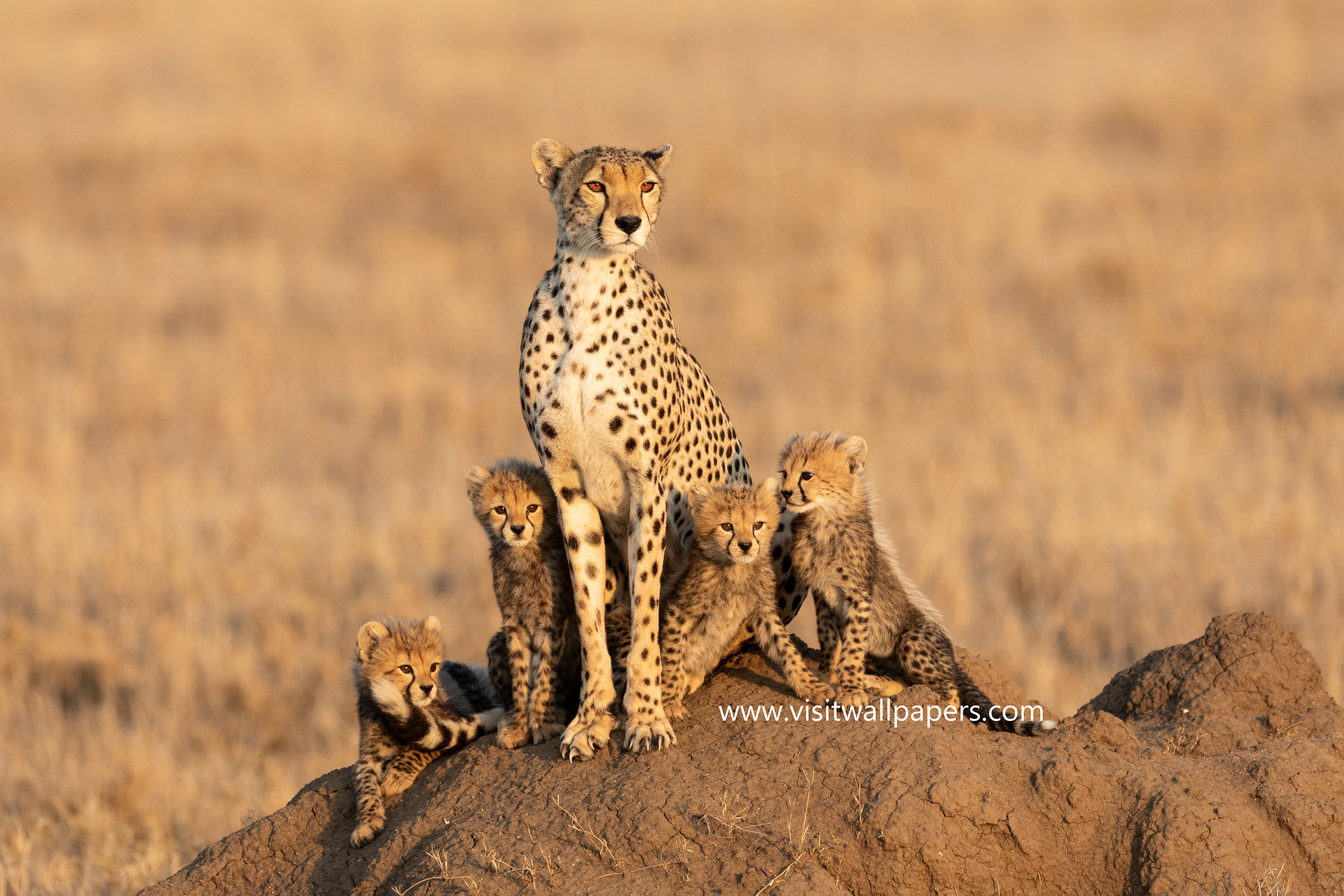 Cheetah_41Female cheetah and her four tiny cubs sitting on a large termite mound with a smooth background with copy space in Serengeti, Tanzania