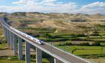 Trains_246 view of a high-speed train crossing a viaduct in Roden, Zaragoza, Aragon, Spain. AVE Madrid Barcelona. Date: 1/2/2020 view of a high-speed train crossing a viaduct in Roden, Zaragoza, Aragon, Spain. AVE Madrid Barcelona.