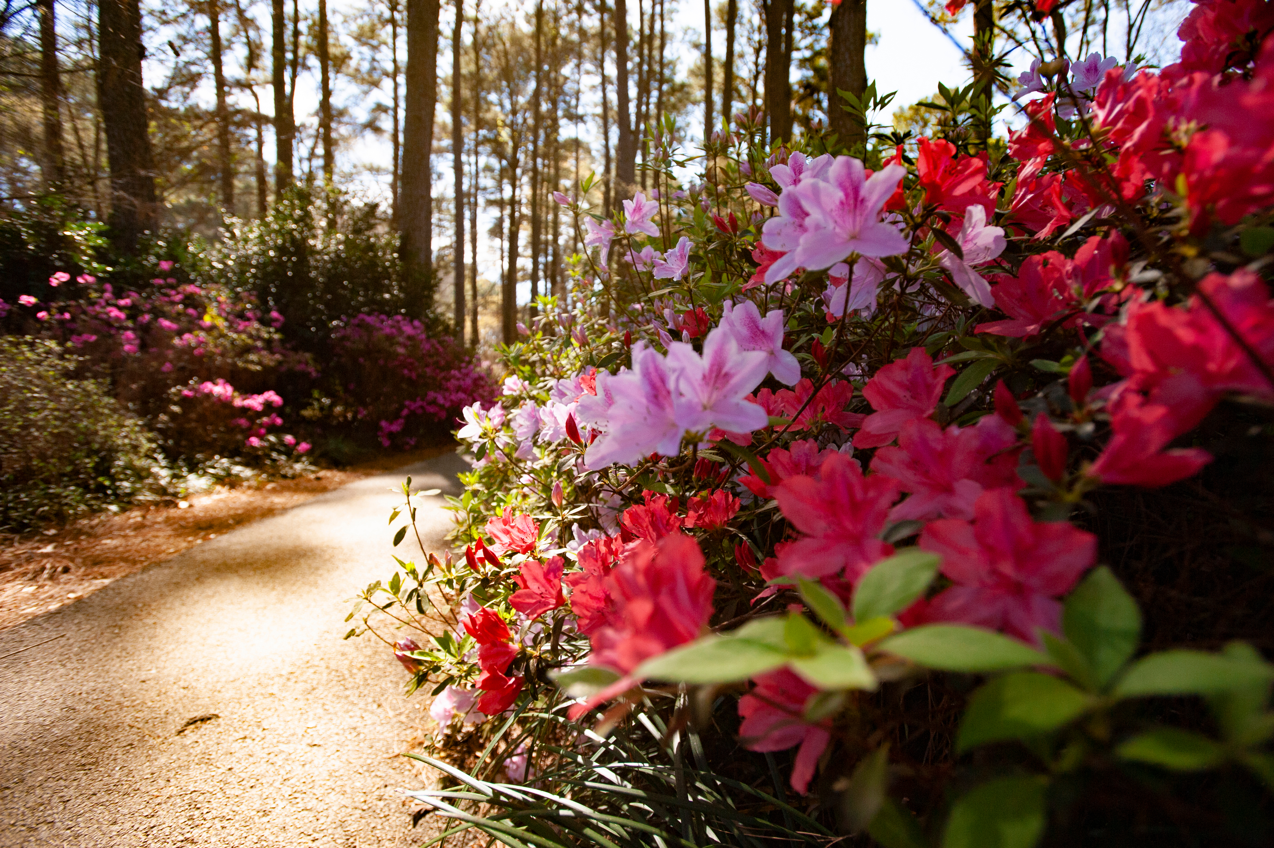 Azalea plants in bloom along a shady trail.
