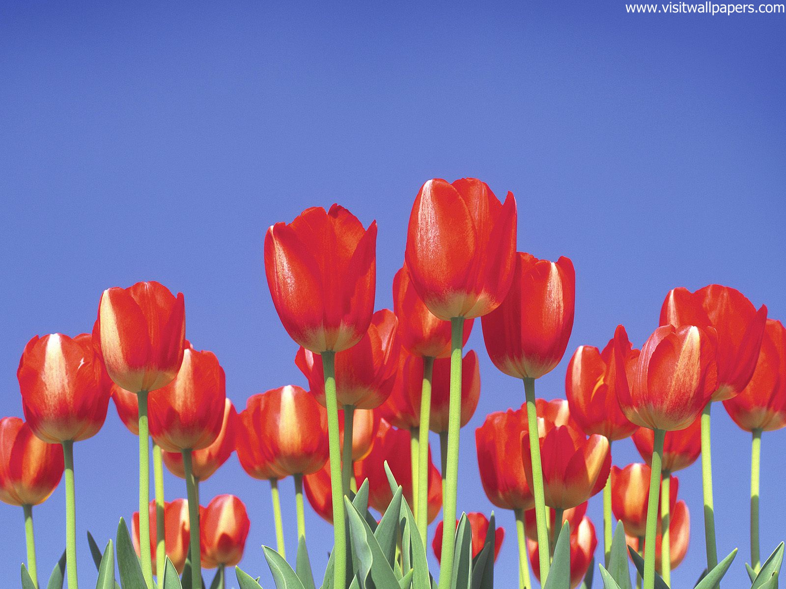 Image of red tulips against vivid blue