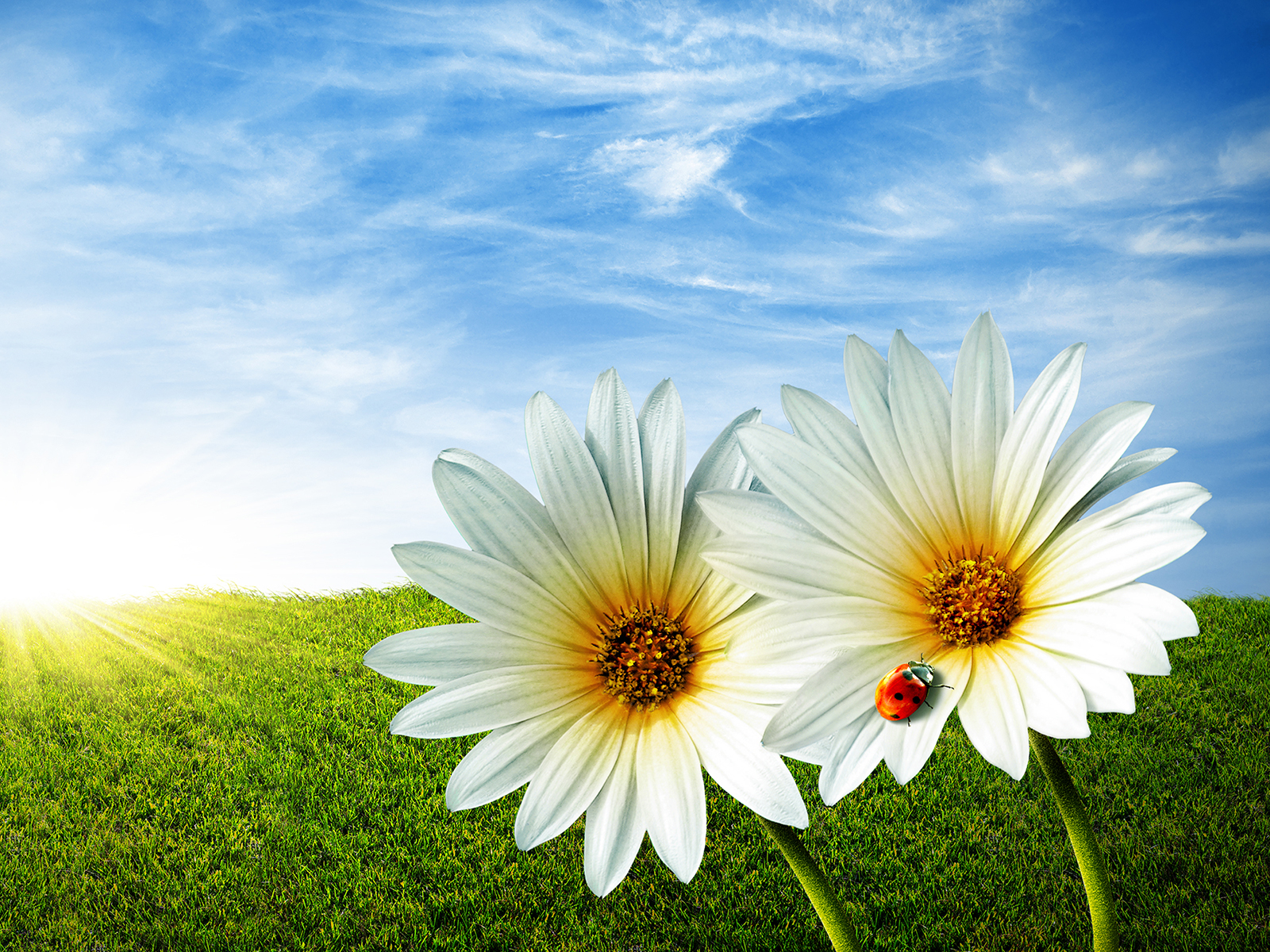 Spring grass field with two daisies and a lady-bug