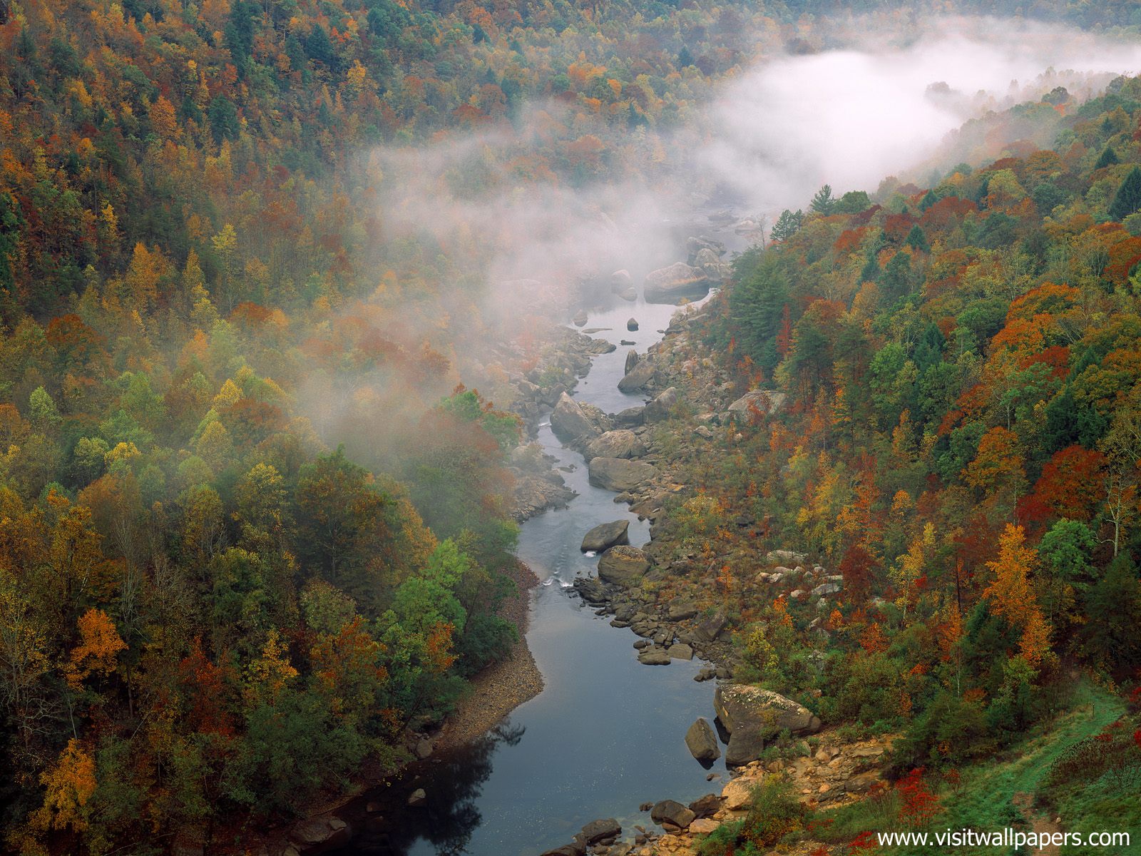 river_245Beautiful Smoky Mountain stream in the Fall season, showing golden, red and green trees lining the stream and rushing water with moss covered rocks.