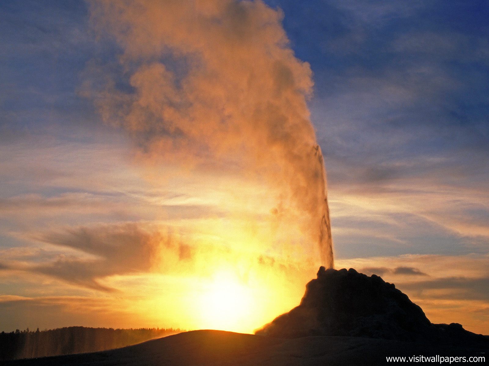 Parks_359Old Faithful Geyser erupts in Yellowstone National Park at sunset.