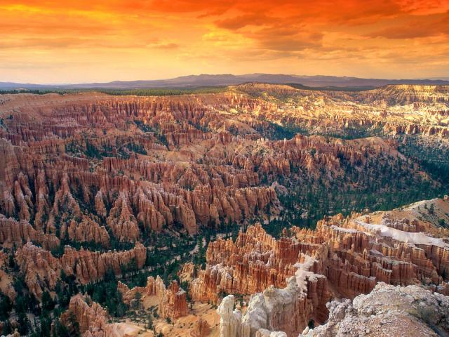 Bryce Canyon National Park, a sprawling reserve in southern Utah, is known for its crimson-colored hoodoos, or spire-shaped rock formations. The park’s main road leads past the expansive Bryce Amphitheater, a hoodoo-filled depression lying below the Rim Trail hiking path. It has overlooks at Sunrise Point, Sunset Point, Inspiration Point and Bryce Point. Prime viewing times are around sunup and sundown.