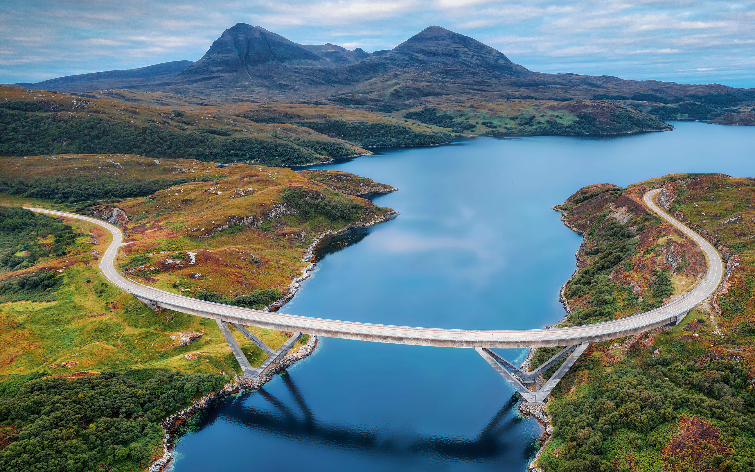 Scotland_080Kylesku Bridge, Scotland The Kylesku Bridge (officially known since 2019 by its Gaelic name Drochaid a' Chaolais Chumhaing) is a distinctively curved concrete box girder bridge in north-west Scotland that crosses the Loch a' Chàirn Bhàin in Sutherland