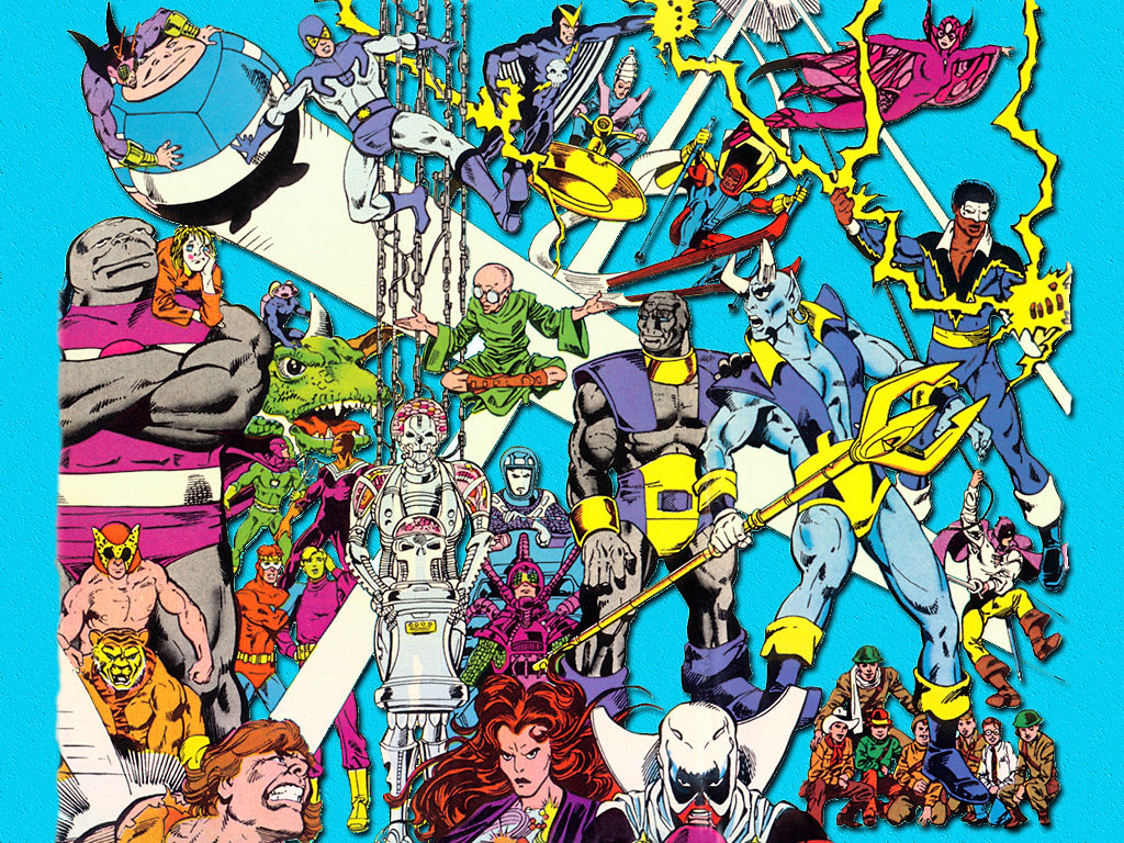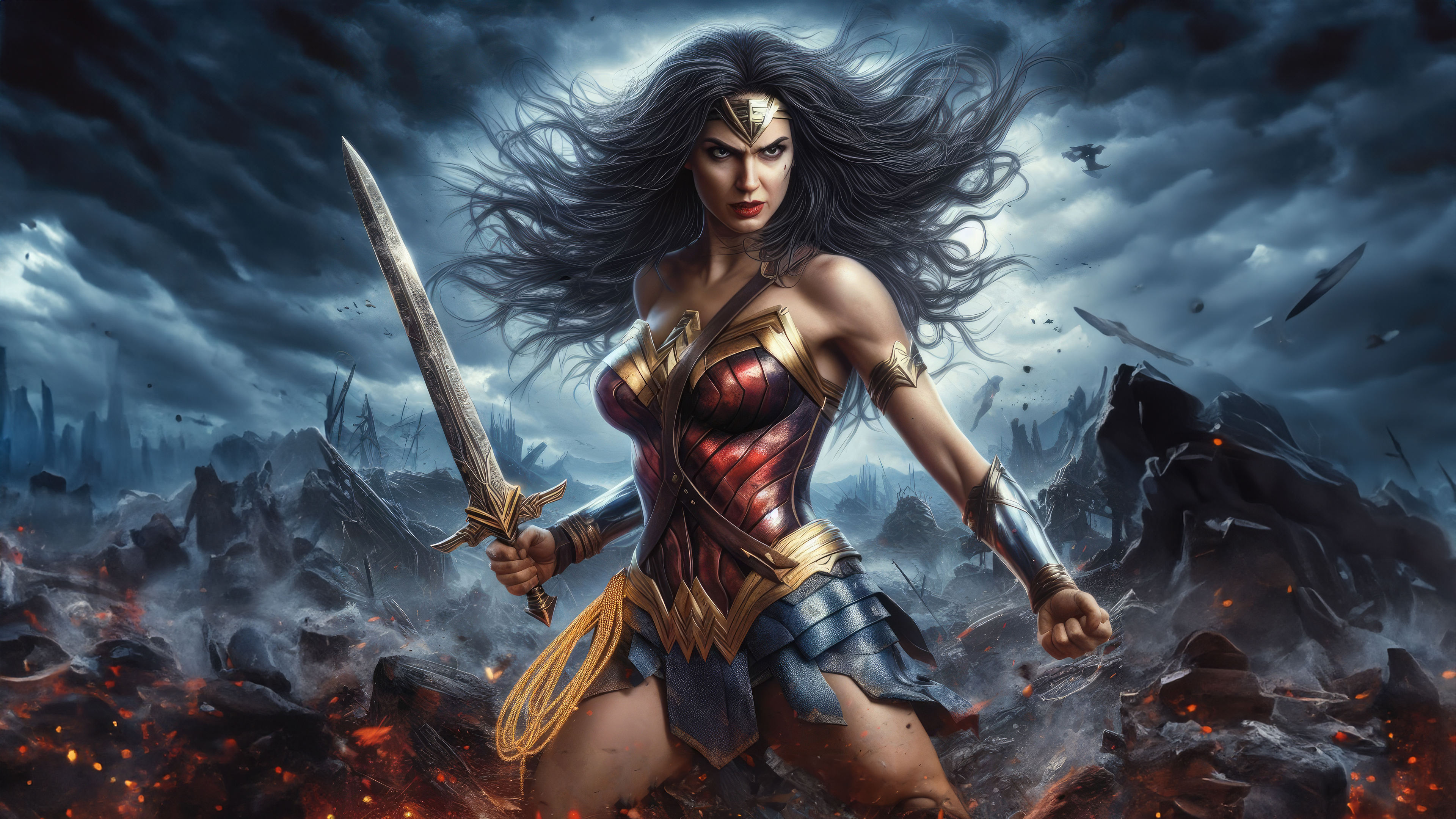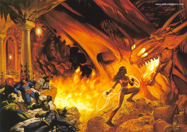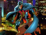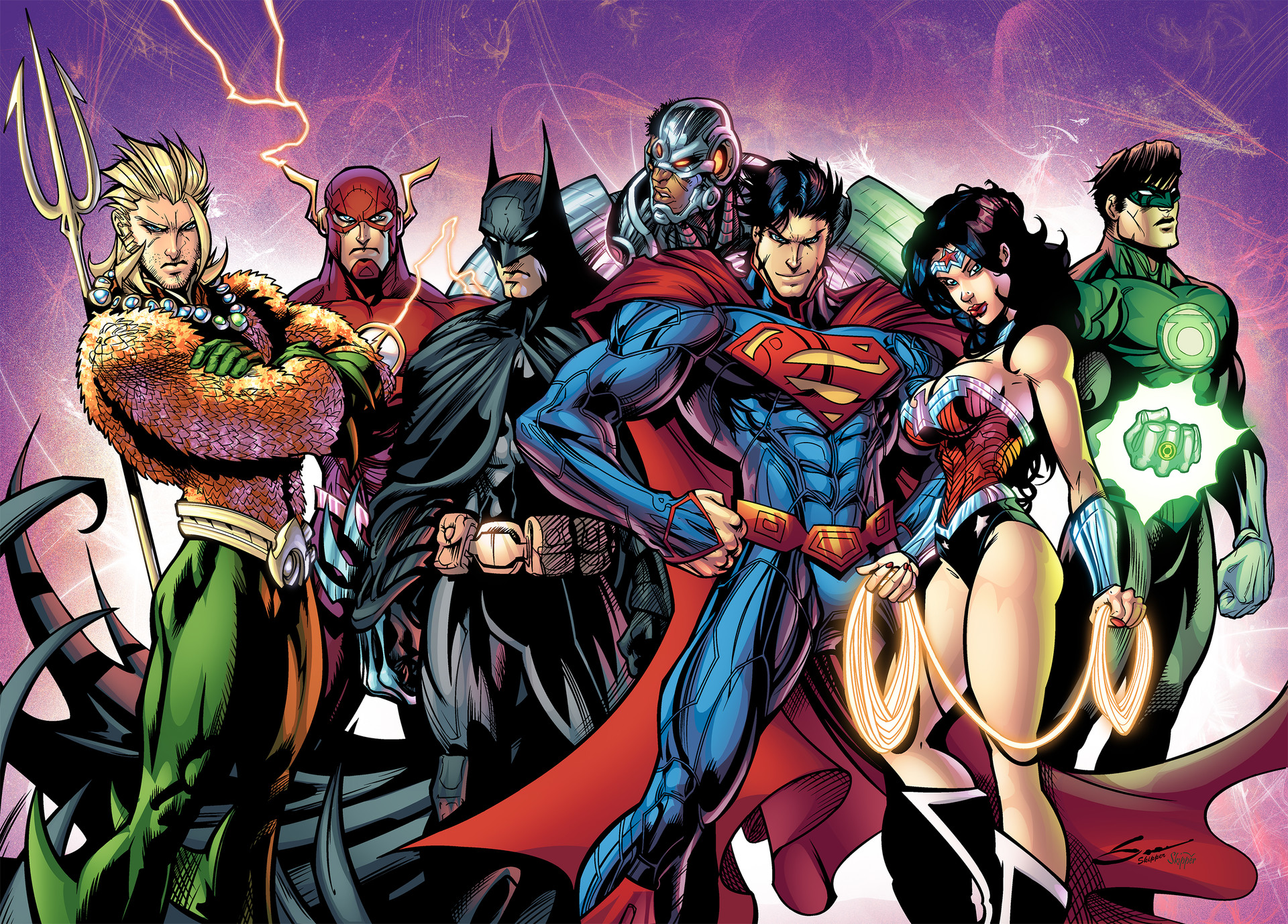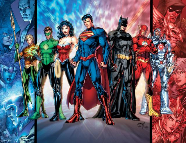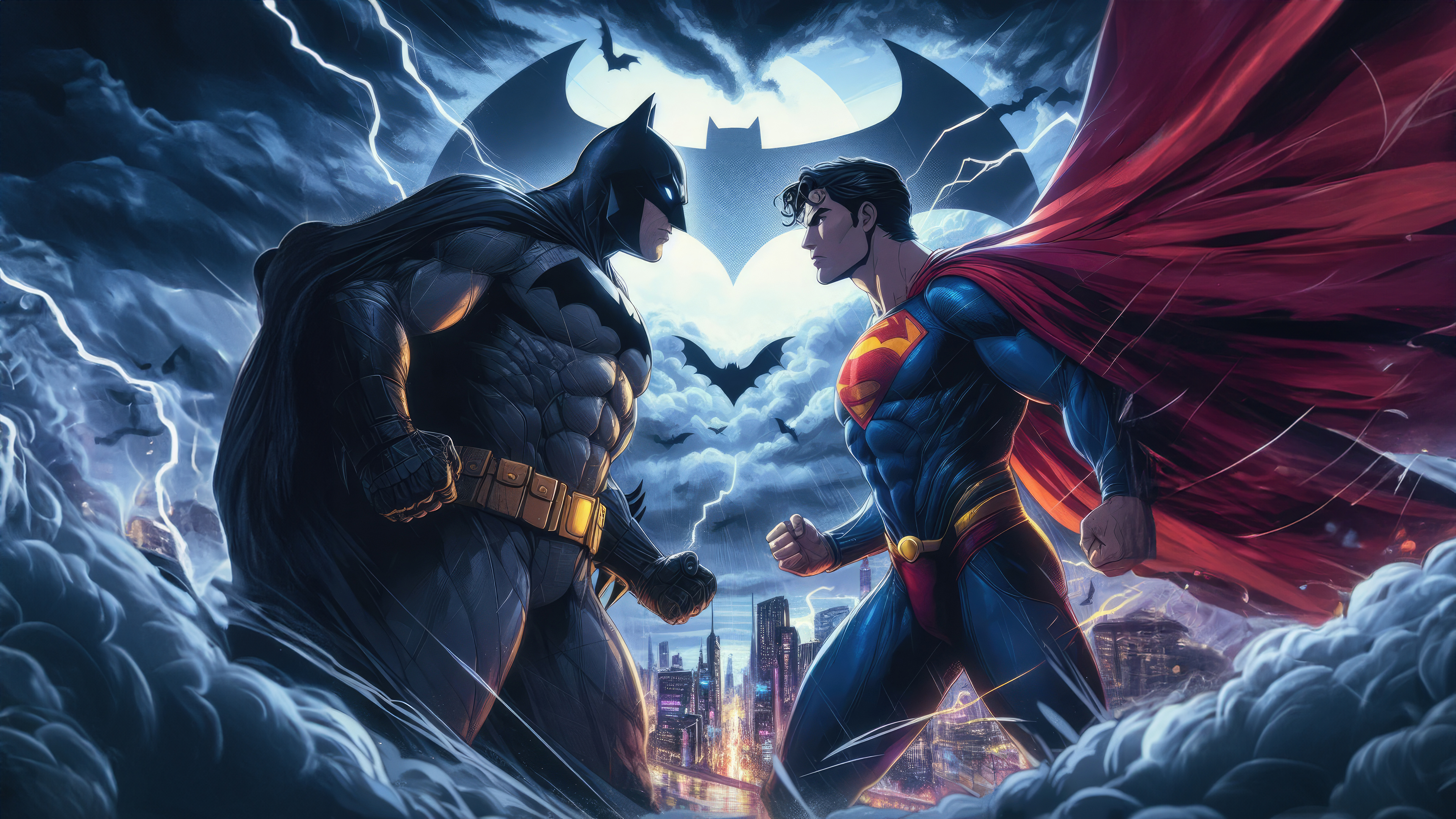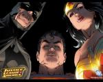 DC_Comics_800Wonder Woman, Superman, and Batman standing atop a gothic cathedral, overlooking a sprawling, rain-soaked city. The heroes are silhouetted against the stormy sky, with lightning flashing around them.
