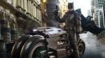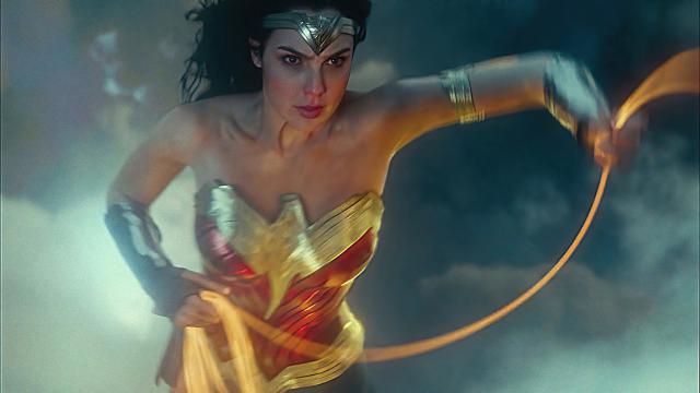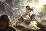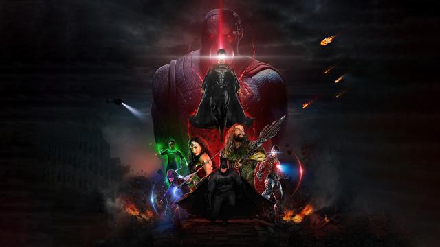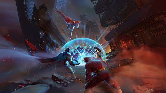 Wonder Woman, Superman, and Batman standing atop a gothic cathedral, overlooking a sprawling, rain-soaked city. The heroes are silhouetted against the stormy sky, with lightning flashing around them.