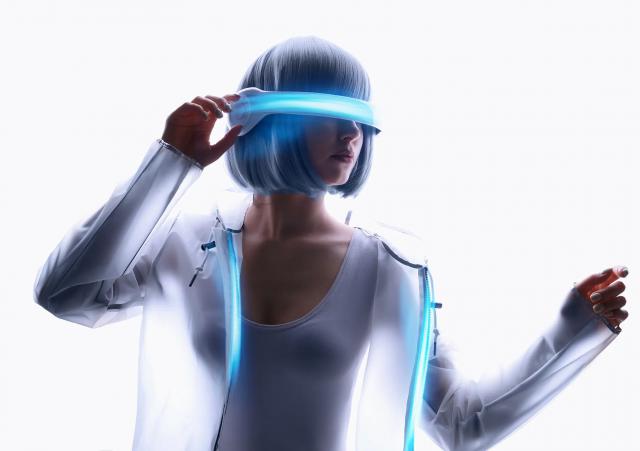 Beautiful_girls_784Beautiful woman with purple hair in futuristic costume over white background. Girl in glasses of virtual reality. Augmented reality, game, future technology, AI concept. VR. Blue neon light