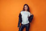 Sexy woman in white t-shirt and jacket on the orange background. Mock-up.