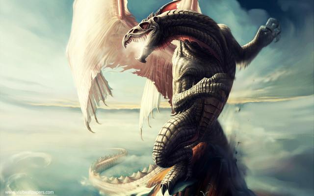 Fantasy_405young sexy woman sits astride a wild dragon. Fantasy photography. huge creature with spikes and wings stands on top of mountain. Beautiful nature dramatic sky white clouds blue fog. Girl elf warrior