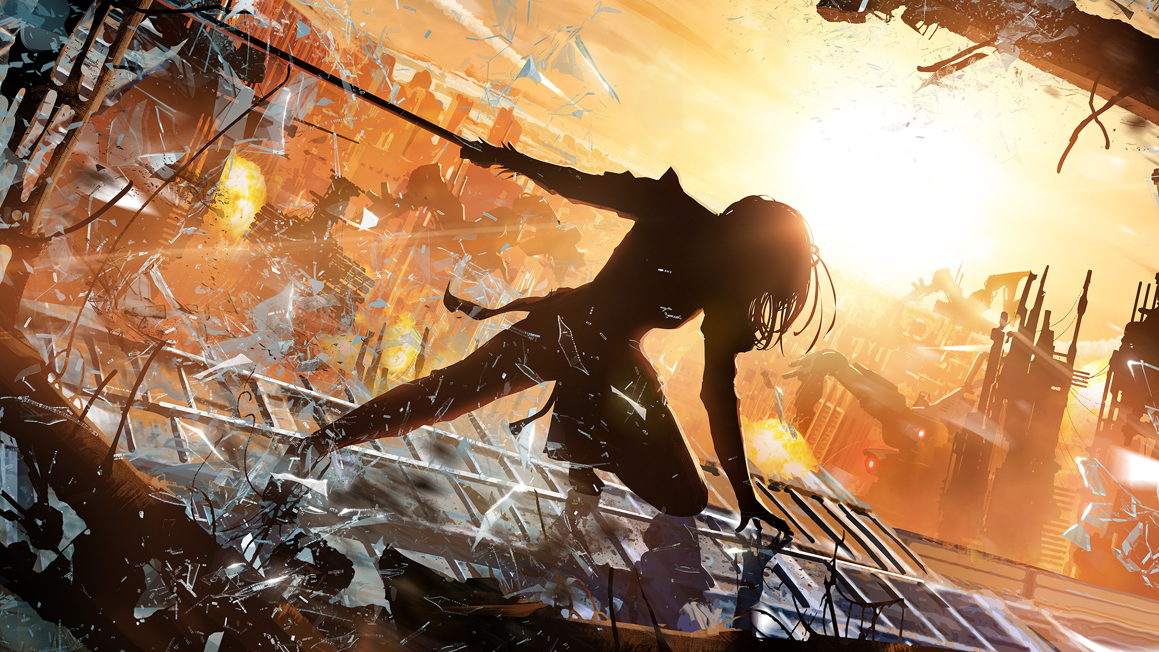 A warrior girl in an epic pose was thrown against a glass building, she was injured, surrounded by thousands of glass fragments, against the backdrop of a crumbling city in the rays of sunset. 2d art