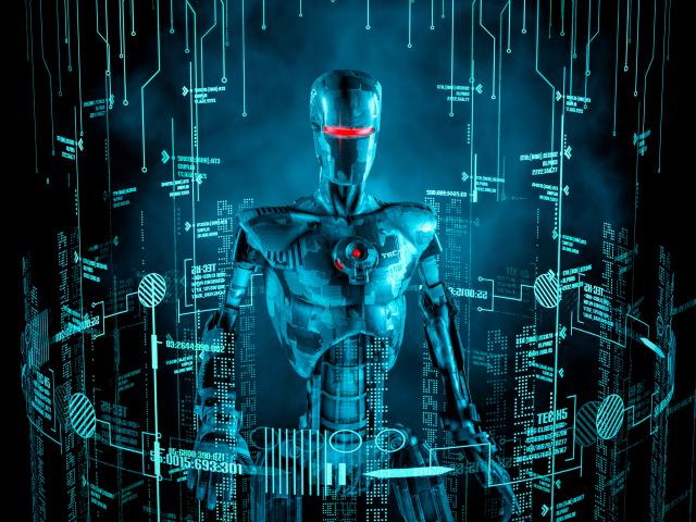 Data robot concept 3D illustration of military android surrounded by glowing virtual user interface
