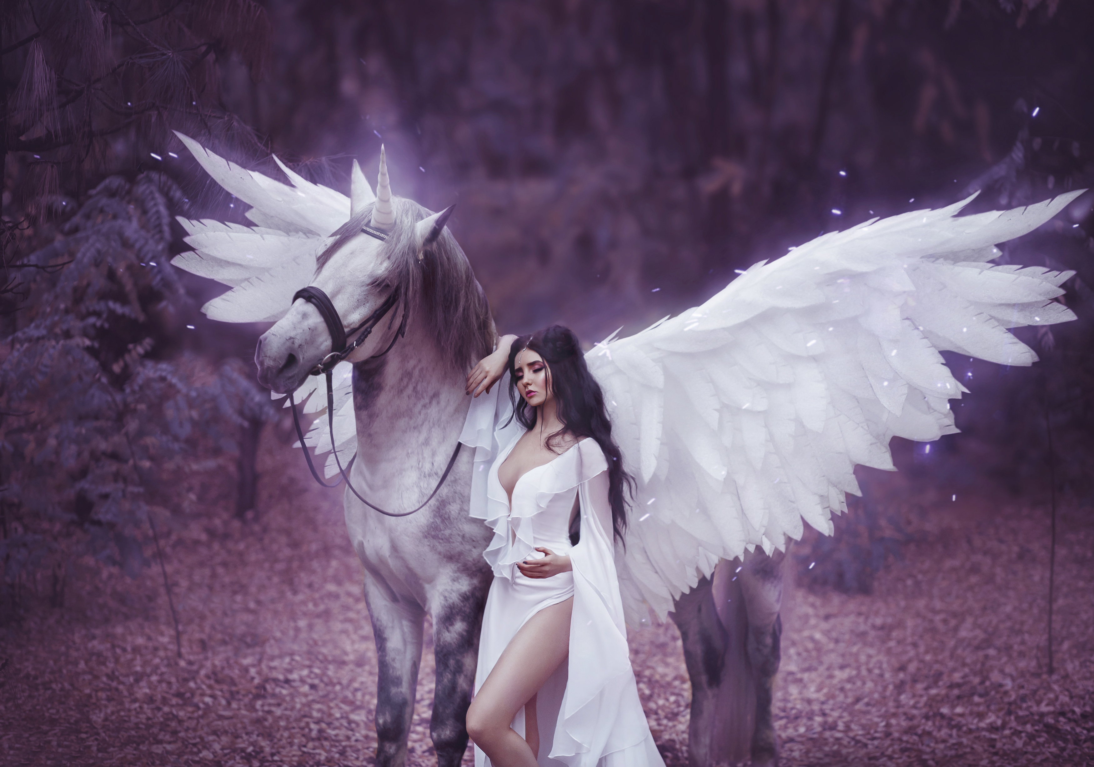 Beautiful, young elf, walking with a unicorn. She is wearing an incredible light, white dress. Art hotography