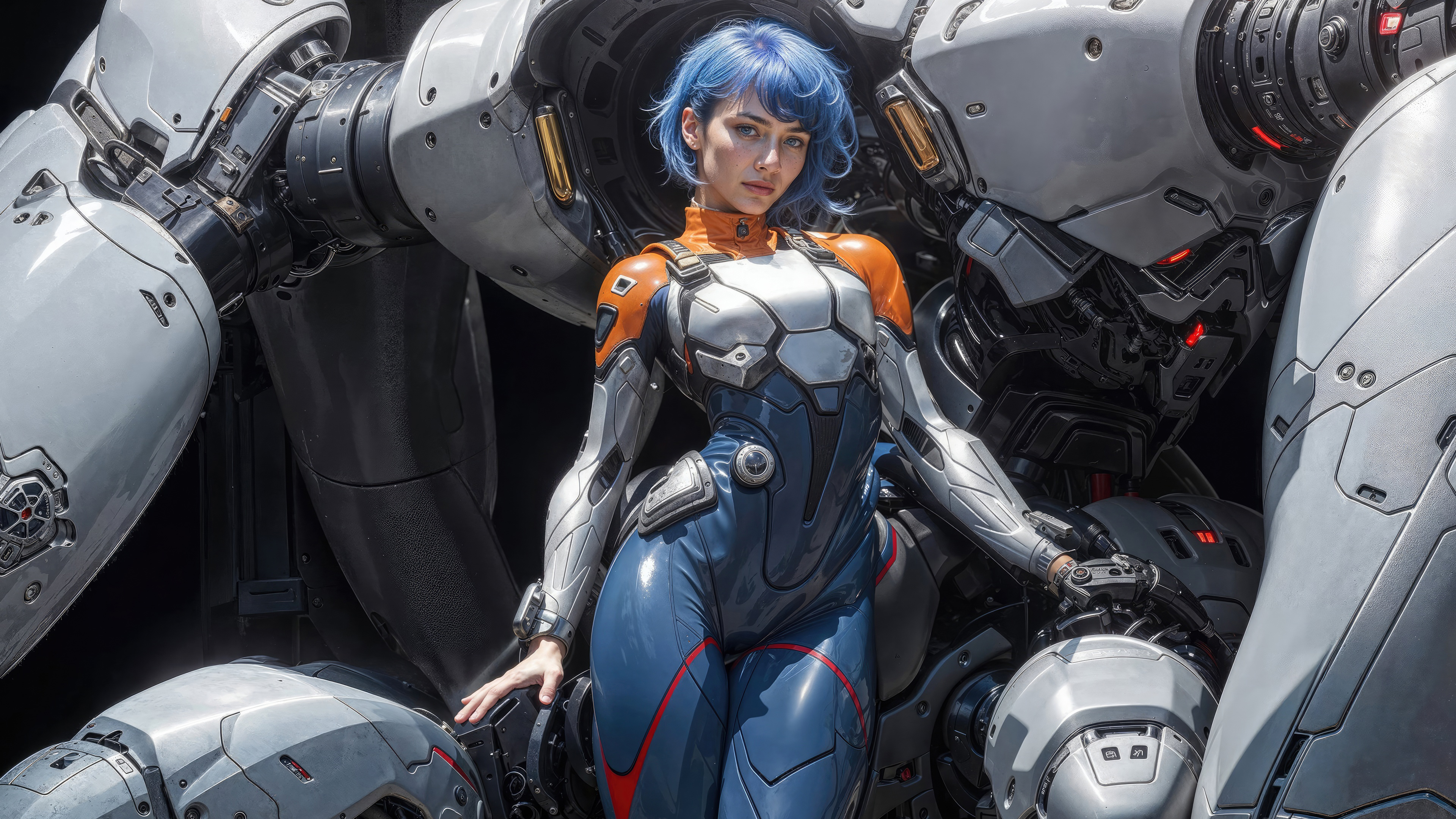 Fantasy_429A woman with a toned, athletic build and striking features, posed seductively with one leg bent and her weight shifted onto her hip, showcasing her cybernetic limbs, including a gleaming metallic arm and leg, adorned with intricate clockwork mechanisms,