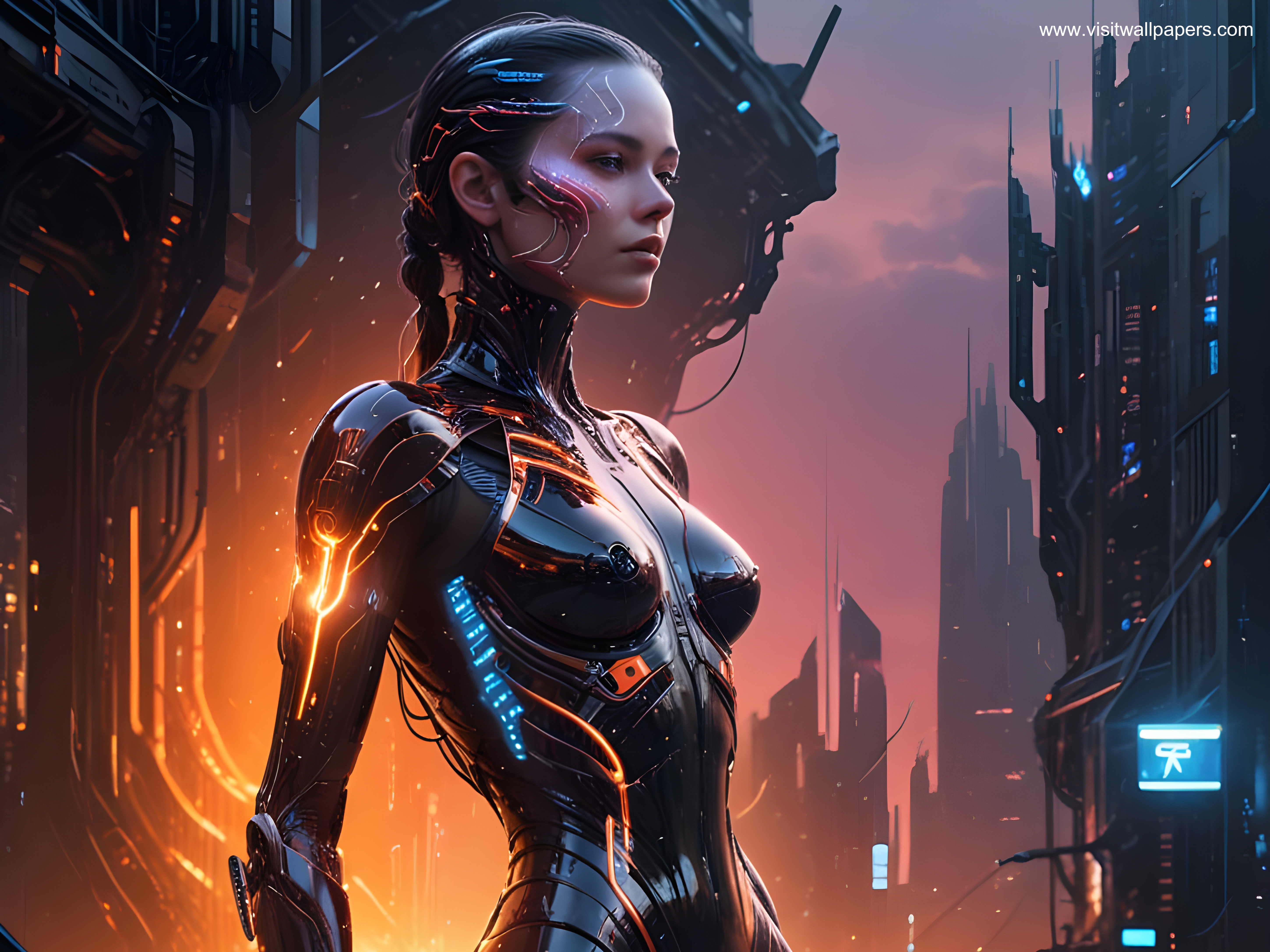 A futuristic, cyberpunk-inspired image featuring a sleek, robotic woman or female cyborg, wears a form-fitting, high-tech yellow jumpsuit, immersed in a vibrant, neon-lit cyberspace. She is adorned with intricate, glowing circuits, embodying the essence of artificial intelligence. The background is a dynamic, ever-changing digital landscape, filled with holographic data streams and towering, neon-lit skyscrapers, symbolizing the limitless potential of technology.