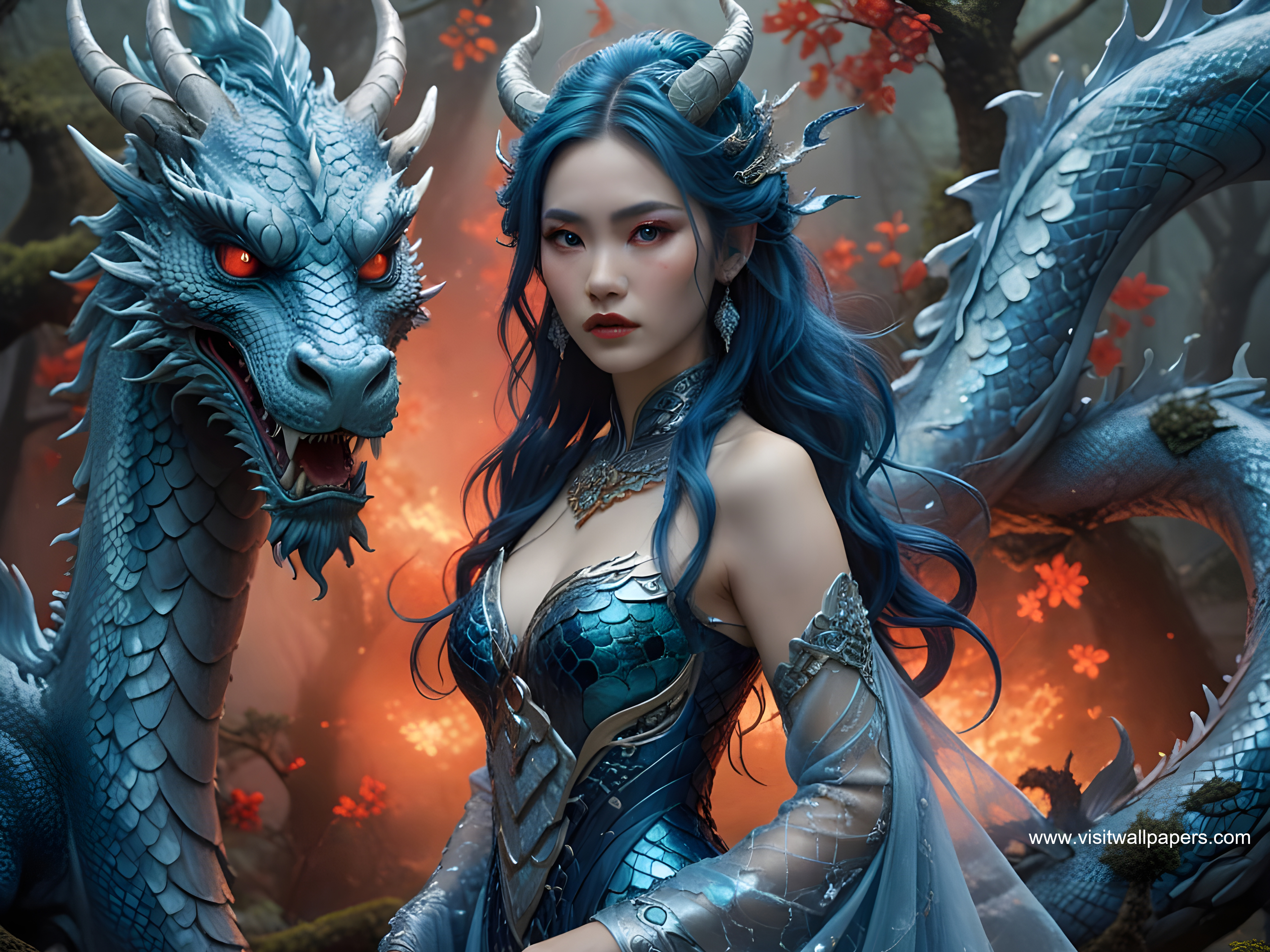 Fantasy_407Fantasy portrait woman warrior queen, hand touches muzzle of ancient dragon. black leather martial costume, embroidered with metal corset sexy armor. Warlike Girl princess zodiac sign. Art style photo