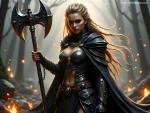 A beautiful, and strong barbarian woman with long, braided blond hair, muscular muscles, and light battle scars, sweating slightly in light black, open-belted leather armor with a belt, buckles, and straps, and a bearskin cloak. She holds a large, giant, massive, two-handed battle axe.