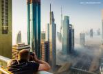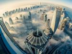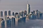 Dubai_138Downtown Dubai with skyscrapers submerged in thick fog. Picture taken from unique view. Tall buildings. Early morning glow.