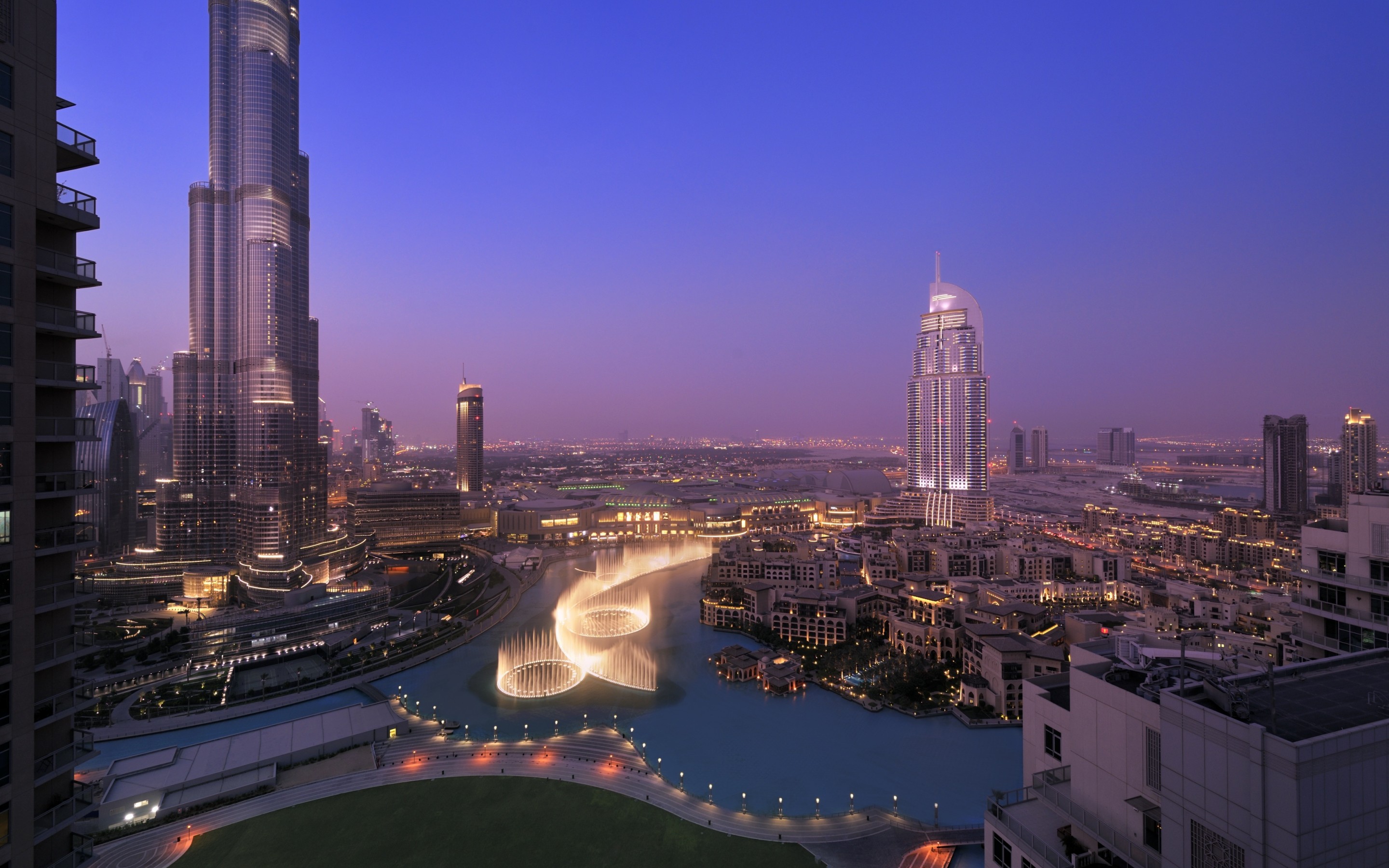 Dubai_128WOW view of Dubai skyline at night. City lights popping. Dancing fountain display. Luxury travel holiday concept.