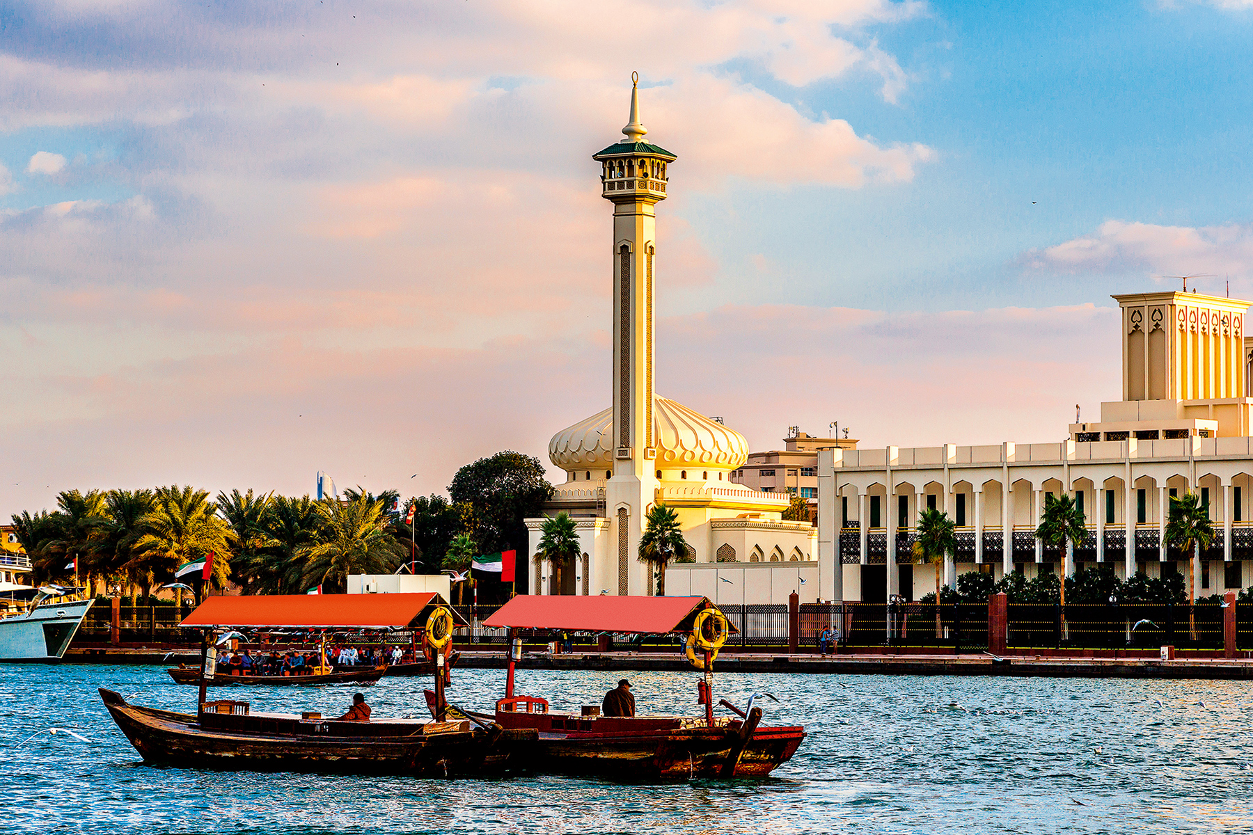Old traditional boats on the bay Creek in Dubai, United Arab Emirates