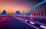Amazing night dubai VIP bridge with beautiful sunset. Private road to Meydan race course, Dubai, United Arab Emirates
