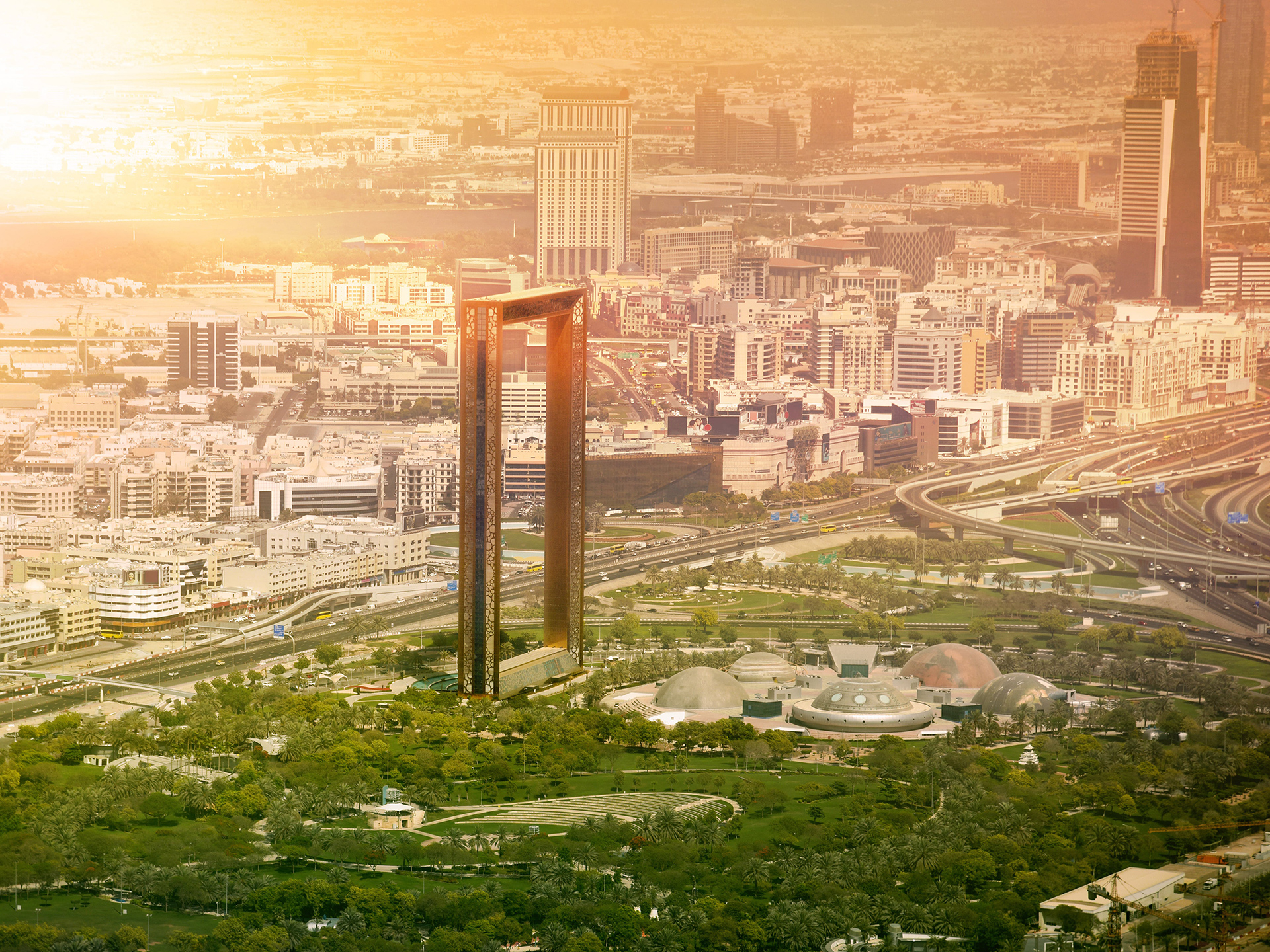 Dubai_136Aerial view of Dubai Frame, Downtown skyline, United Arab Emirates or UAE. Financial district and business area in smart urban city. Skyscraper and high-rise buildings at sunset.