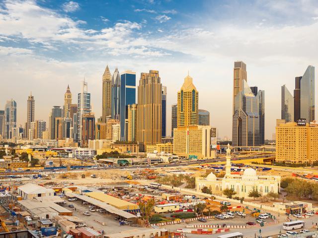 Dubai skyline with beautiful city close to it's busiest highway on traffic