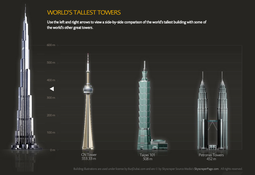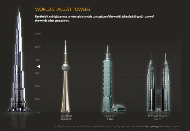 The Burj Khalifa , known as the Burj Dubai prior to its inauguration in 2010, is a skyscraper in Dubai, United Arab Emirates. It is known for being the world’s tallest building. With a total height of 829.8 m (2,722 ft, or just over half a mile) and a roof height (excluding antenna, but including a 223 m spire[2]) of 828 m (2,717 ft), the Burj Khalifa has been the tallest structure and building in the world since its topping out in 2009, supplanting Taipei 101, the previous holder of that status.[3][4]