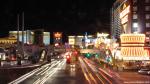 Red light trails from vehicle traffic streak across a busy intersection in front of Taipei 101.