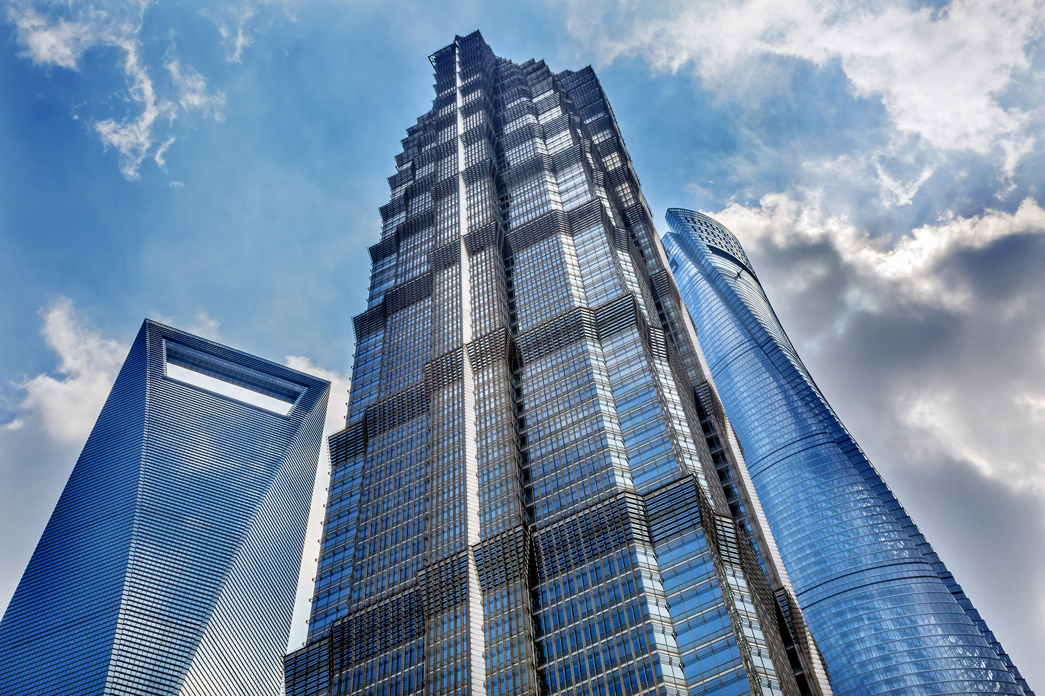 buildings_450Jin Mao Tower Three Skyscrapers Reflections Make Patterns and Designs Liujiashui Financial District Shanghai China. Shanghai Tower and Shanghai World Financial Center