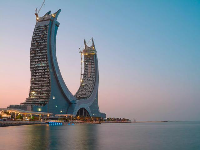 buildings_453Lusail, Qatar- August 30,2021 : Crescent tower in Lusail Katara Twin Towers, consisting of a hotel and residential project, located on an approximately 48,000 m2 plot on the shoreline in Lusail, Doha, symbolically intertwined with Qatar’s heritag