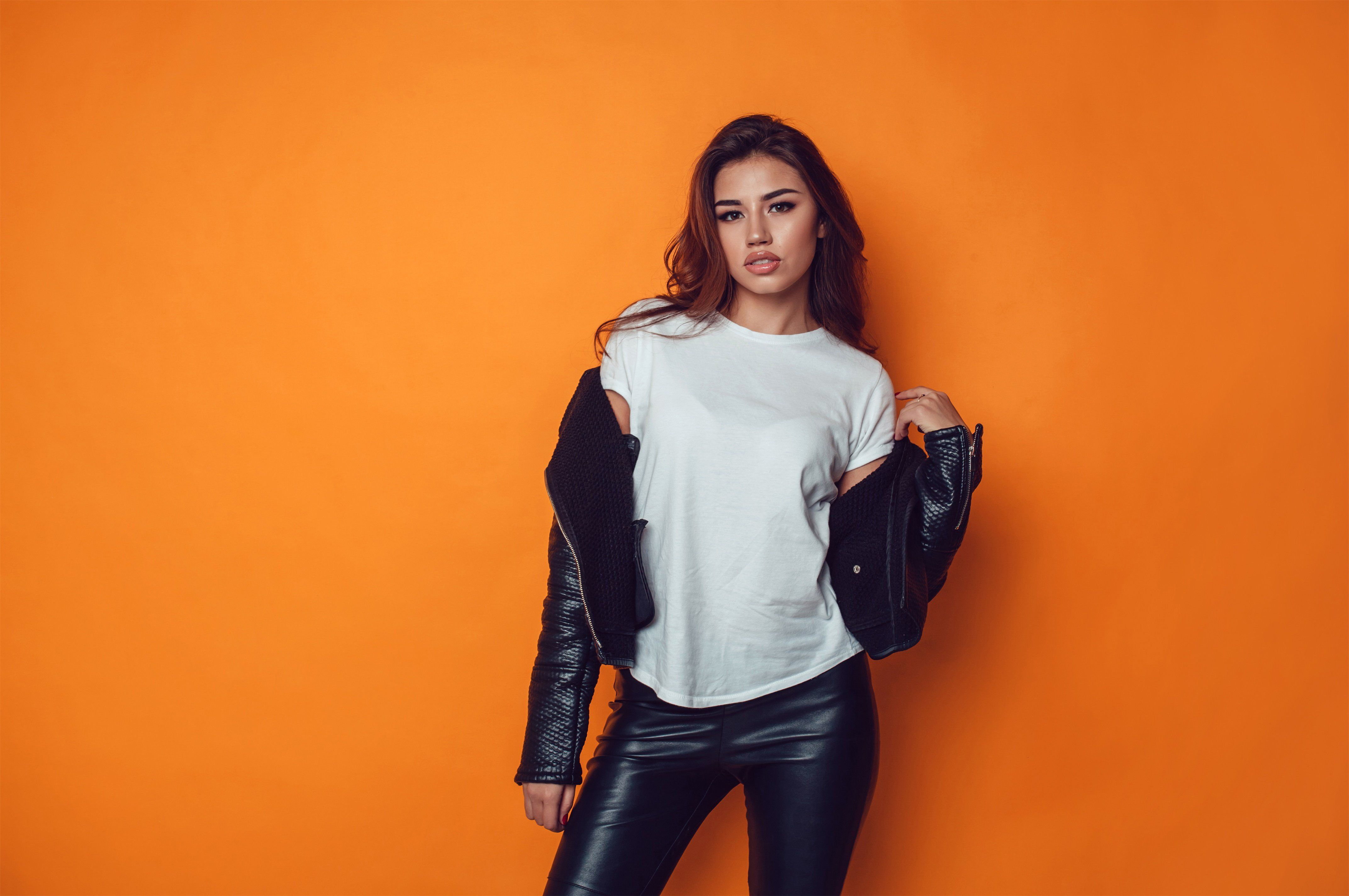 Beautiful_girls_777Sexy woman in white t-shirt and jacket on the orange background. Mock-up.
