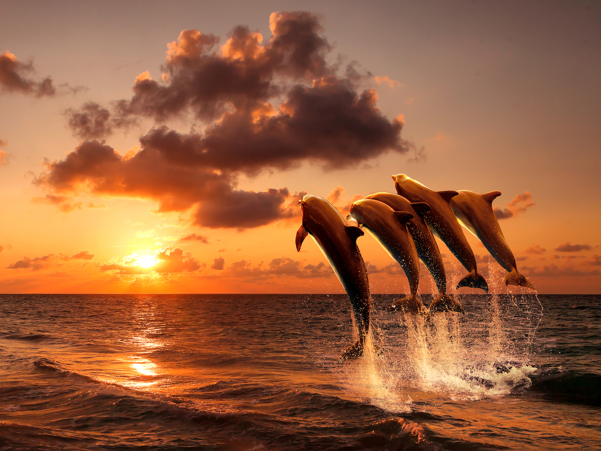 ocean-life-792Four beautiful dolphins jumping over waves. Hawaiian Pacific Ocean wildlife scenery. Marine animals in their natural habitat.