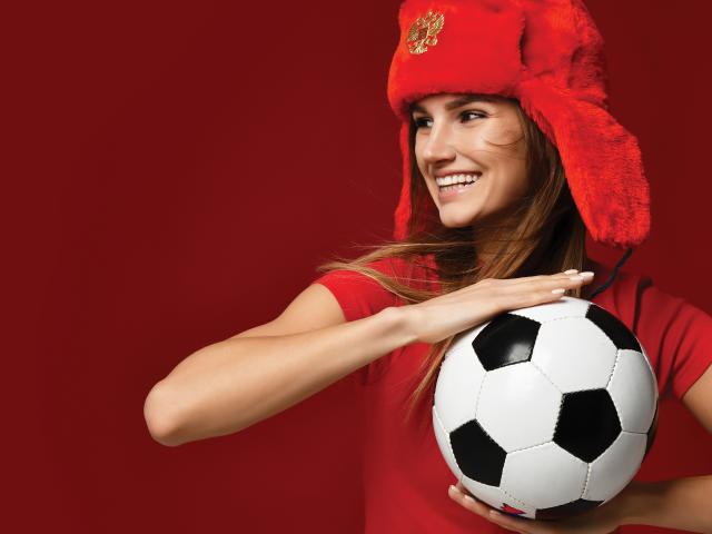 Beautiful_girls_724Russian style fan sport woman player in red uniform and ear-flap hat hold soccer ball celebrating happy smiling