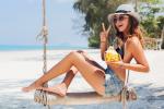 Beautiful_girls_747young attractive sexy woman on vacation sitting on swing by sea, tropical beach, drinking cocktail in coconut, skinny legs, traveling in Thailand, smiling, happy, positive emotion, summer style