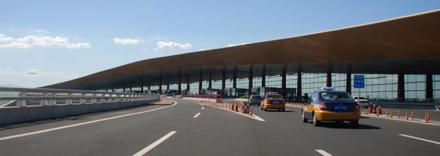A view of the approach to Beijing Airport's impressive Terminal 3 - An architectural masterpiece with advanced design, it expands China's busiest airport capacity dramatically. It is the size of 170 soccer