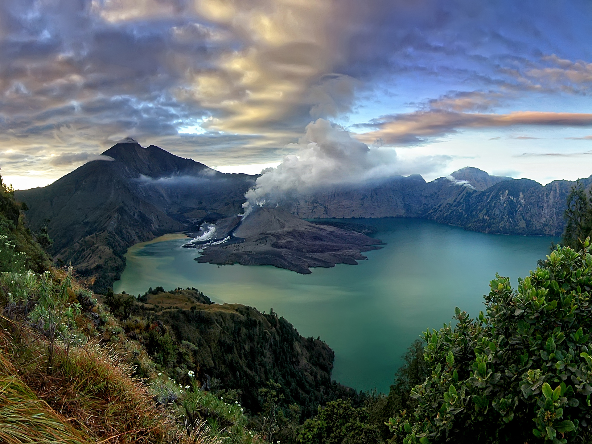 Indonesia_110 Scenery of Mount Rinjani, active volcano and crater lake from the summit at sunrise, Lombok - Indonesia. Date: 12/31/2018 Scenery of Mount Rinjani, active volcano and crater lake from the summit at sunrise, Lombok - Indonesia.