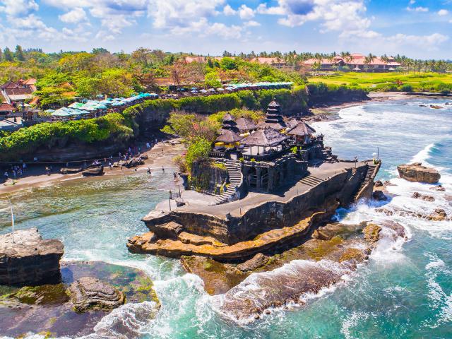 Indonesia_210 Aerial View of Tanah Lot Temple, Bali, Indonesia. Tanah Lot is a rock formation off the Indonesian island of Bali. It is home to the ancient Hindu pilgrimage temple Pura Tanah Lot (literally "Tanah Lot temple"), a popular tourist and cul Date: 4/4/2024 Aerial View of Tanah Lot Temple, Bali, Indonesia