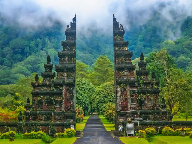 Indonesia_172 Gates to one of the Hindu temples in Bali, Indonesia. Rainy season in Bali, Indonesia. After the rain, the mountains are misted. Date: 8/28/2022 Gates to one of the Hindu temples in Bali, Indonesia.