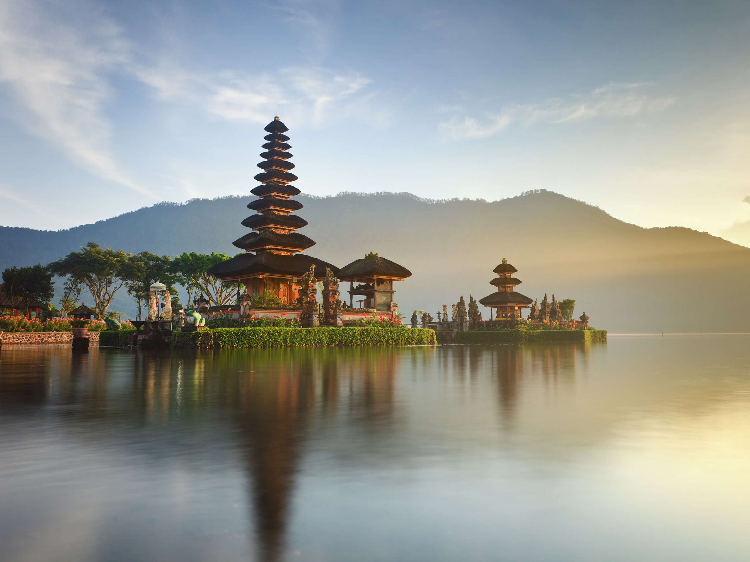 Indonesia_137 Pura Ulun Danu temple at sunrise on a lake Bratan, Bali, Indonesia Date: 11/10/2019 Pura Ulun Danu temple at sunrise on a lake Bratan, Bali, Indonesia