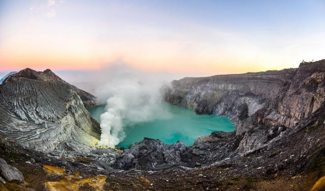 Indonesia_196 Mount ijen volcanic crater at sunrise with sulfur fog Date: 10/17/2023 Mount ijen volcanic crater at sunrise with sulfur fog