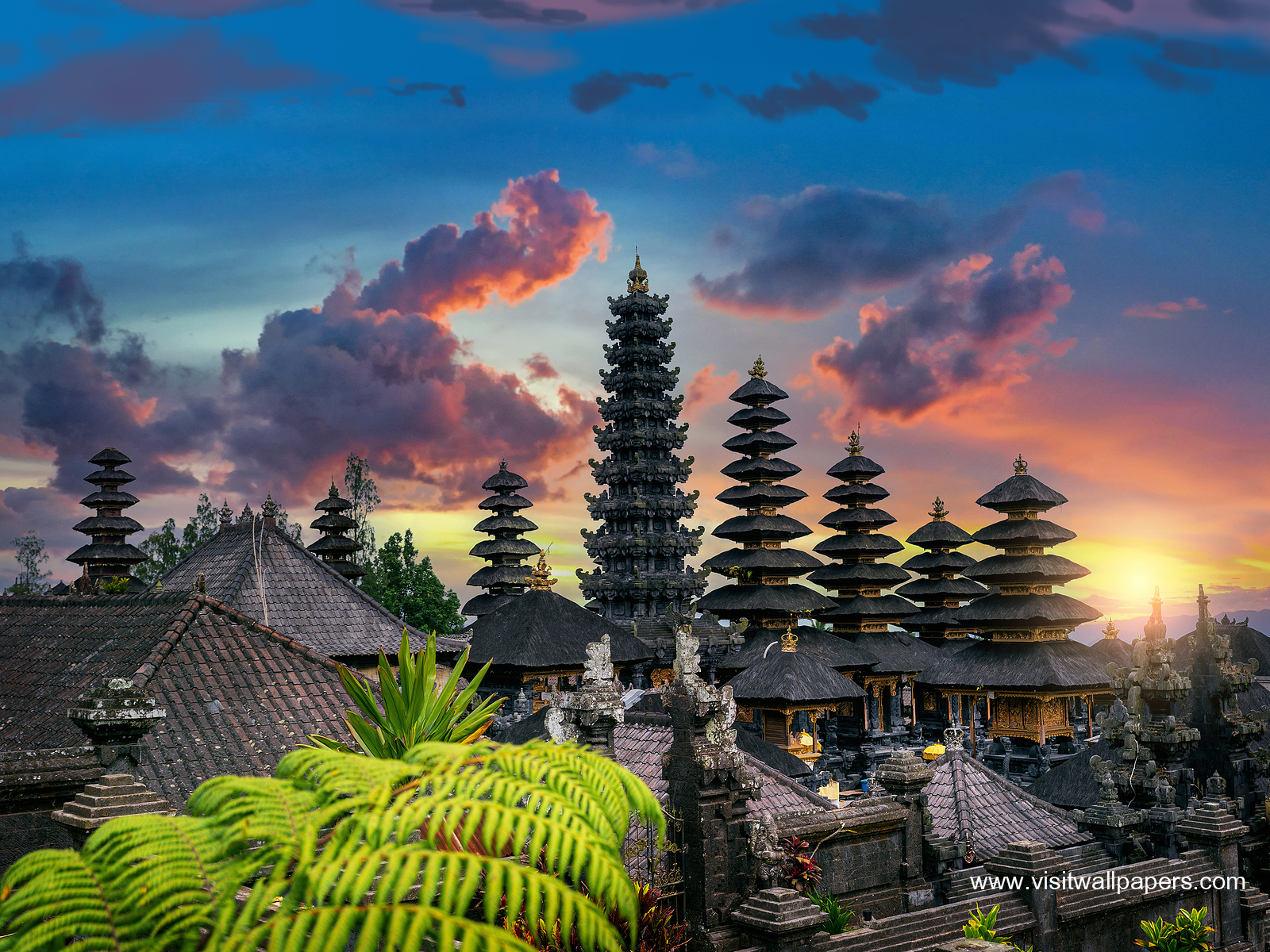 Indonesia_201 Besakih temple at sunset in Bali, Indonesia. Roofs in Pura Besakih Temple in Bali Island, Indonesia.Pura Besakih is a temple complex in the village of Besakih on the slopes of Mount Agung in eastern Bali, Indonesia. It is the most important, the l Date: 10/18/2023 Besakih temple at sunset in Bali, Indonesia. Roofs in Pura Besakih Temple in Bali Island, Indonesia.