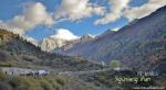 siguniang_027View of Siguniang Mountain from Lama Temple, Siguniangshan NP, Sichuan, China. Placards/flags read 'Om Mani Padre Hum' in Tibetan, a famous Sanskrit mantra embodying the teachings of Buddha.
