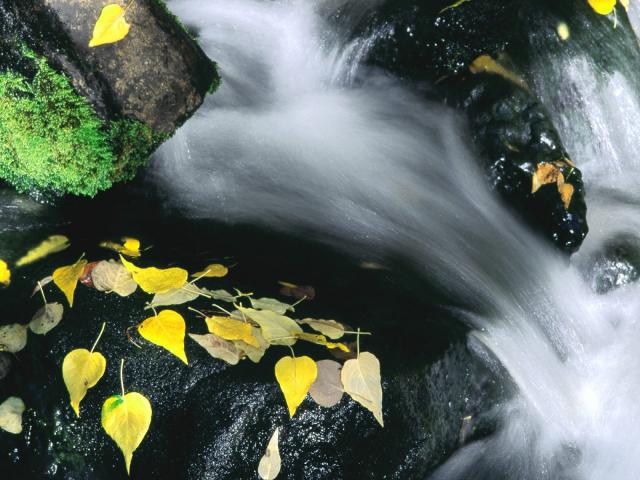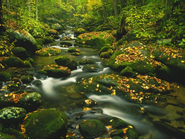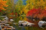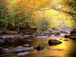 river_245Beautiful Smoky Mountain stream in the Fall season, showing golden, red and green trees lining the stream and rushing water with moss covered rocks.