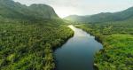Beautiful natural scenery of river in southeast Asia tropical green forest with mountains in background, aerial view drone shot