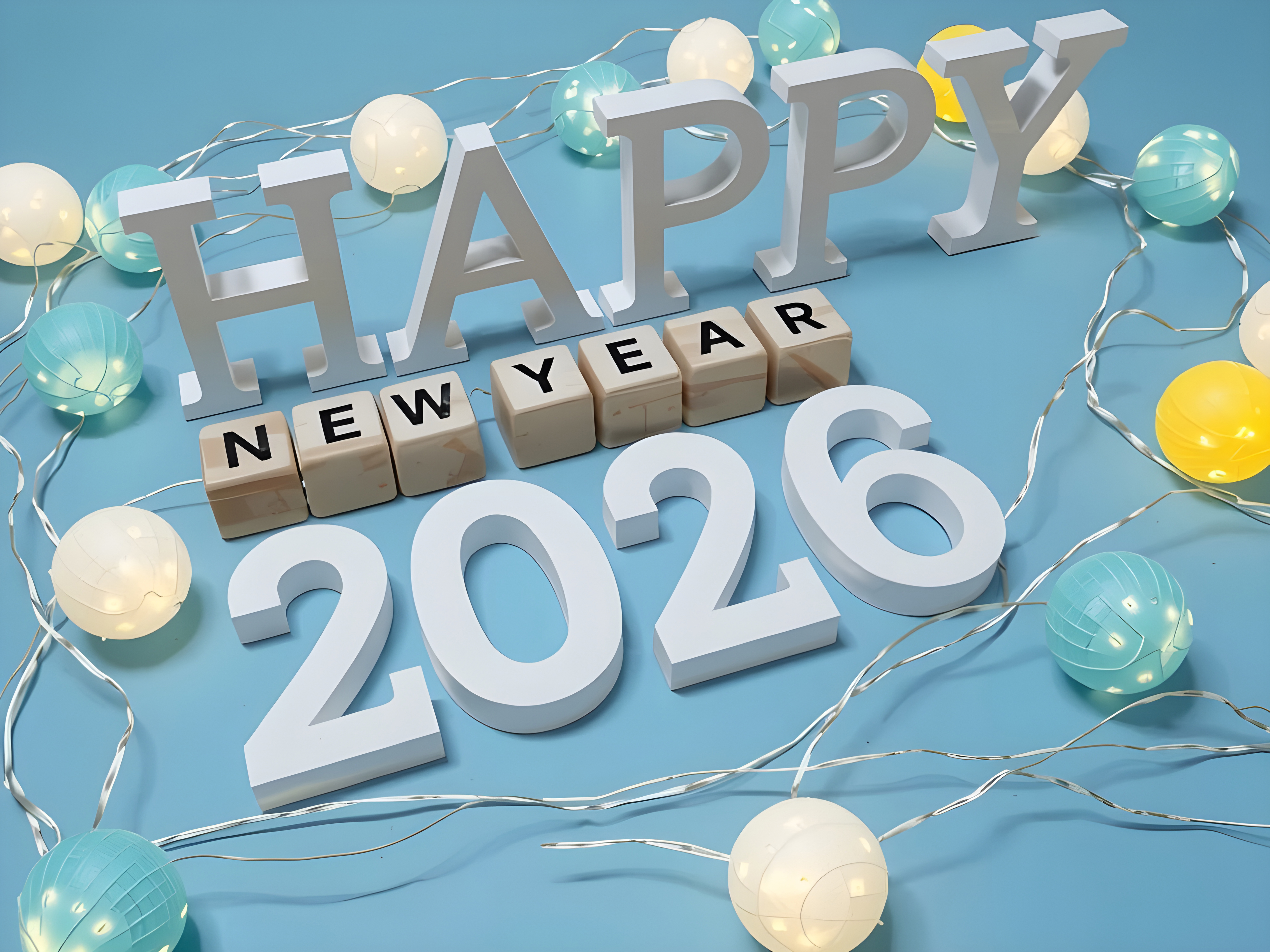 Happy New Year 2026 alphabet letter with LED cotton balls on blue background.