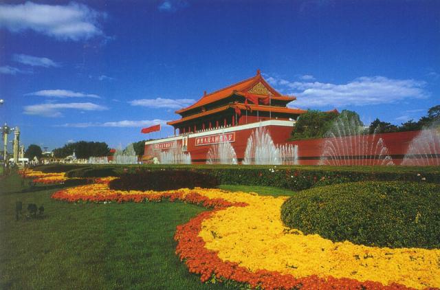 china_859China Tiananmen gate with Great Wall in background. Chinese text on the red wall reads: Long live China and the unity of all peoples in the world.