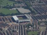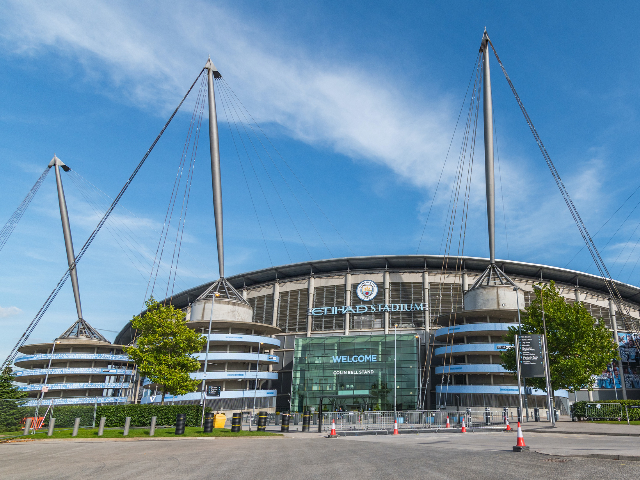 Aerial view from above of the Etihad Stadium, home of Manchester City FC.