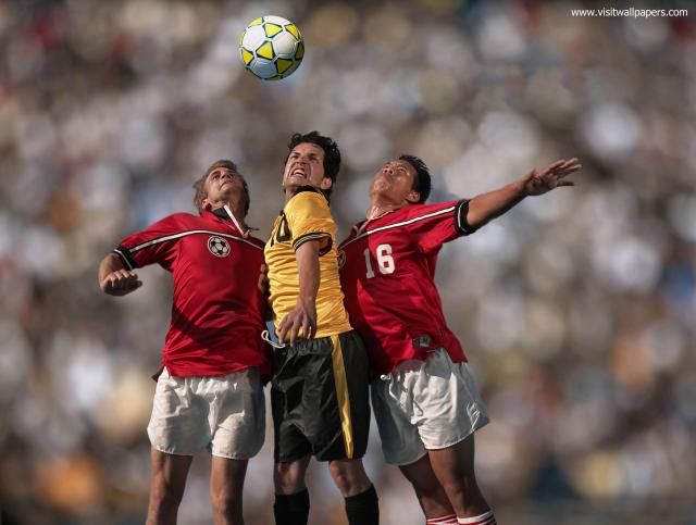 soccer_88Three soccer players on a professional stadium fight for ball. Soccer stadium with tribunes, illuminations and spectators.